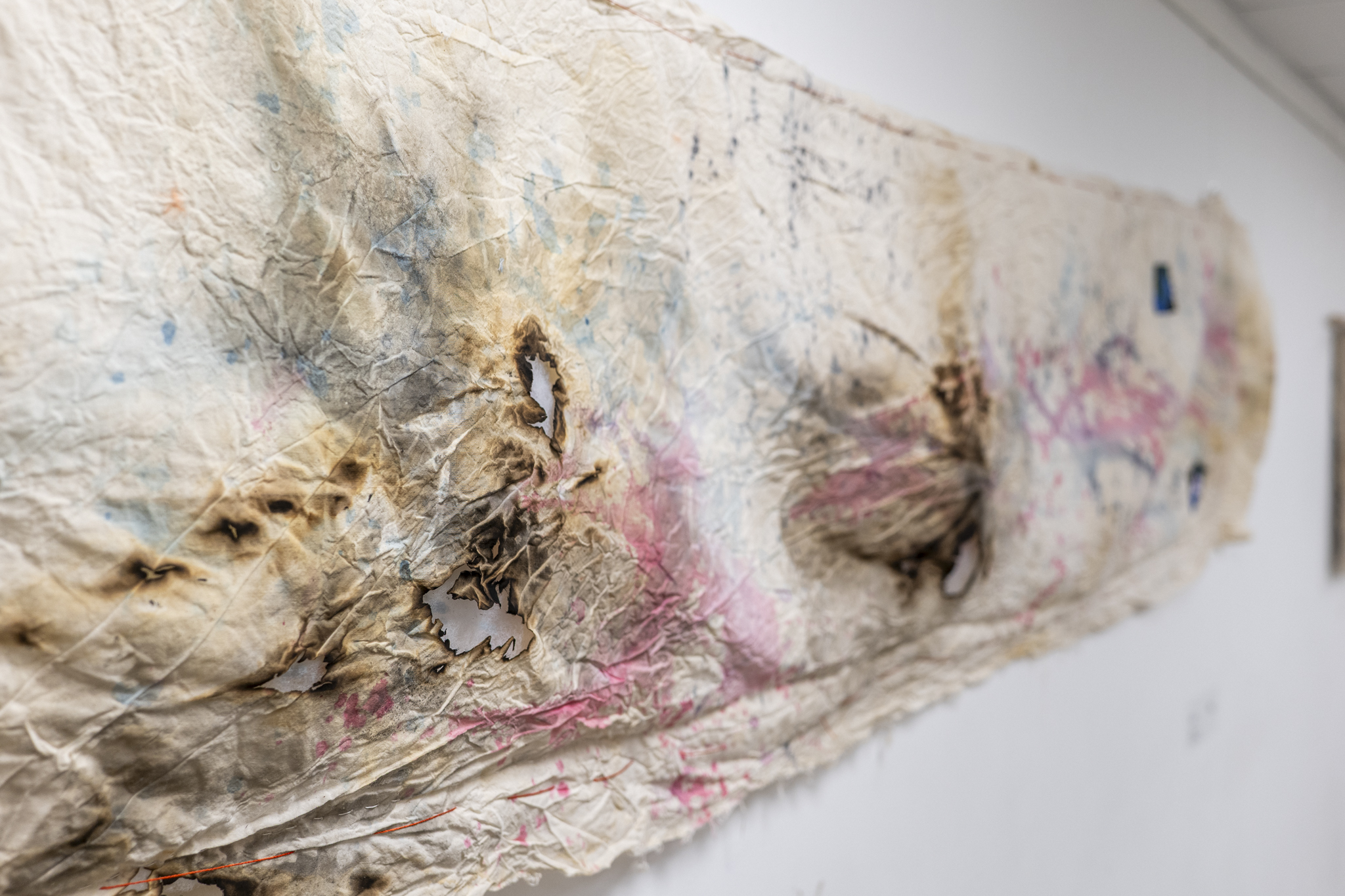 Kūrėjo darbuose ryškus egzistencinis matmuo: degimo pėdsakai, nutrūkusios linijos, trapūs paviršiai ir efemeriški atspaudai kalba apie laikinumą, irimą, žmogaus būties pažeidžiamumą. Tuo pačiu tai yra ir kūrybos kaip atkūrimo, sujungimo, „susiuvimo“ veiksmas. Autorius kviečia patirti tekstilę ir grafiką kaip dvi skirtingas, tačiau susisiejančias mąstymo formas – vieną lėtą ir taktilišką, kitą spontanišką ir efemerišką.